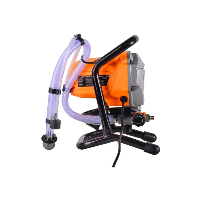 Аппарат подходит для работы с различными типами лакокрасочных материалов, включая краски, лаки, грунтовки и антисептики. Диаметр сопла 0,017" (0,43 мм) оптимальный размер для работы с большинством лакокрасочных материалов. Длина шланга высокого давления 7,6 м обеспечивает удобство при работе на больших площадях и в труднодоступных местах.