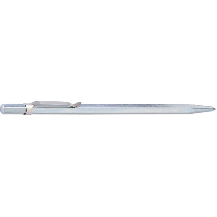 Изготовлена из высокопрочной инструментальной стали, хромированная. Твердосплавный наконечник. Удобная для хвата шестигранная рукоятка с зажимом для крепления к карману рабочей одежды. Предназначена для нанесения разметки на металлические поверхности.
