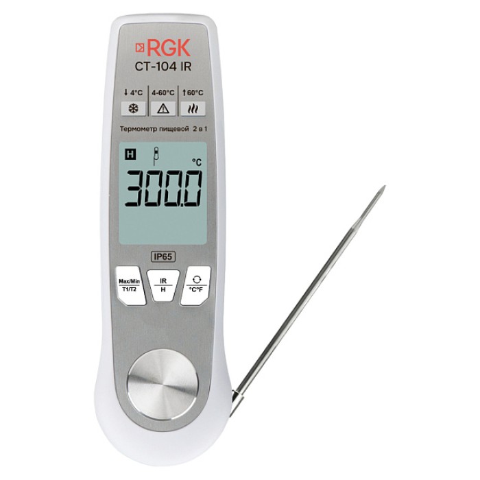 Пищевой термометр RGK CT-104 IR представляет собой комбинированный инструмент, обеспечивающий контроль поверхностной и внутренней температуры продуктов, сырья, полуфабрикатов, а также других целевых объектов, для чего оборудуется инфракрасной системой, реализующей функции пирометра, и погружным зондом. Обладая широким измерительным диапазоном, изделие подходит как для отслеживания условий хранения термолабильной продукции, в том числе замороженной, так и для оценки соблюдения технологии приготовления пищи с применением тепловой обработки. Комбинированный измеритель температуры внесен в Госреестр СИ и может задействоваться в качестве средства оперативного контроля при инспекционных проверках, в ходе экспертиз и для решения других задач, попадающих под государственное регулирование.