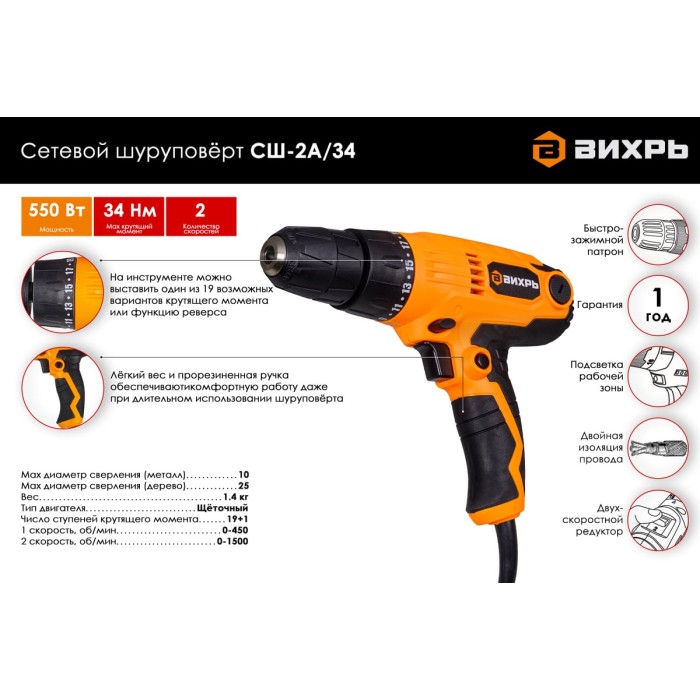 Сетевой шуруповерт Вихрь СШ-2А/34 72/16/3 мощностью 550 Вт предназначен для бытового использования от однофазной сети. Скорость вращения шпинделя имеет две ступени регулировки с максимальной частотой 450 и 1500 об/мин. Быстрозажимной патрон отличается удобством замены оснастки размером 0.8-10 мм. Максимальный диаметр отверстий для металла составляет 10 мм, для древесины - 25 мм.