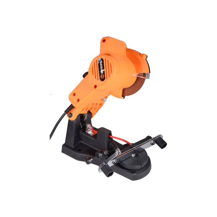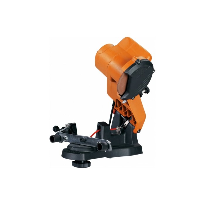 Станок для заточки цепей оснащён системой автоматического зажима, что делает его более удобным по сравнению с другими моделями, а также сокращает время заточки. На корпусе модели есть удобная рукоятка, за которую можно держать станок в процессе точения. Его можно зафиксировать на верстаке, используя специальные отверстия в корпусе. Это снизит вибрации и ускорит работу. Положение цепи регулируется специальным установочным винтом, за счёт чего гарантирована правильная заточка под необходимым углом. У данной модели есть специальная шкала, благодаря которой легко регулировать наклон и угол.