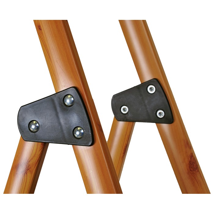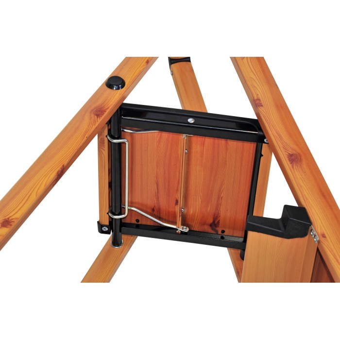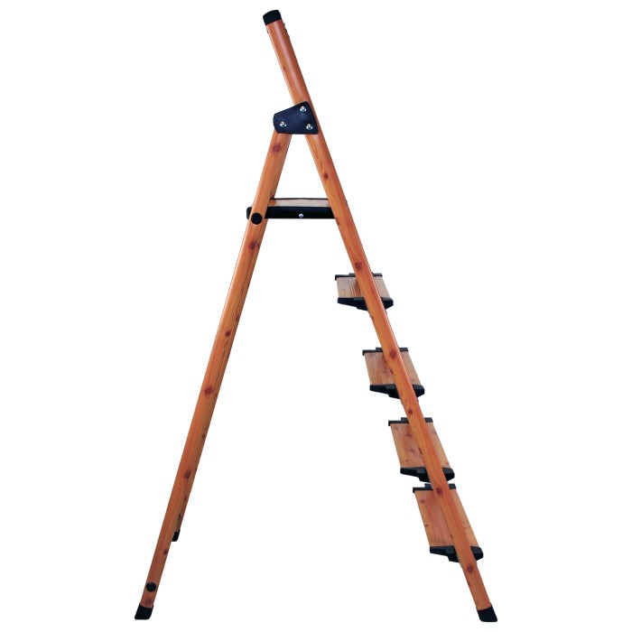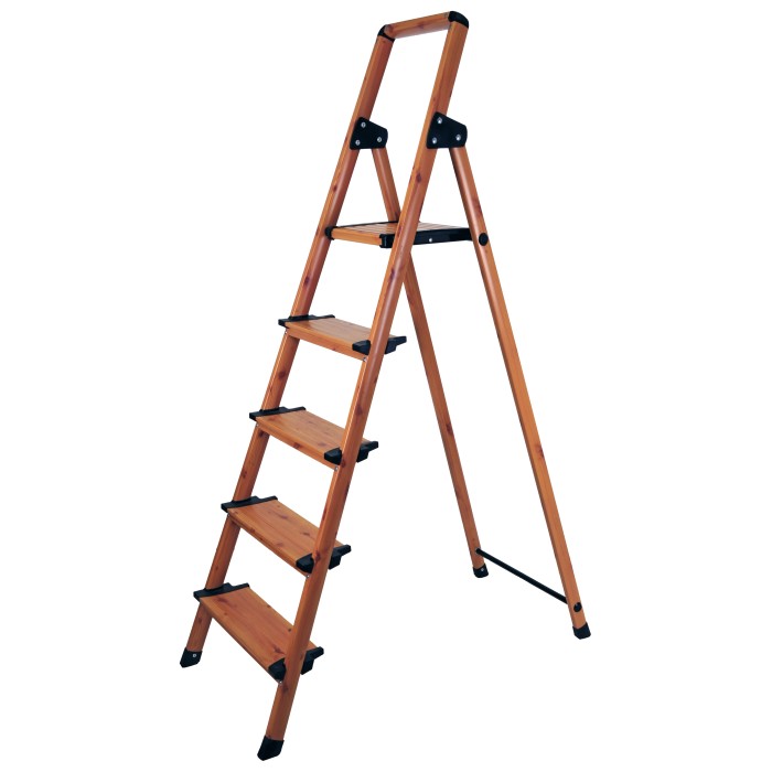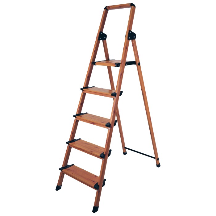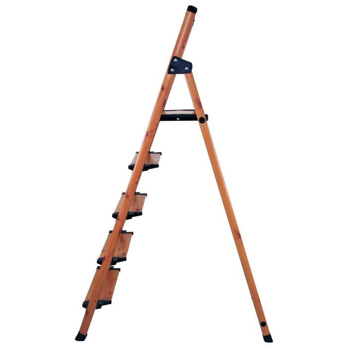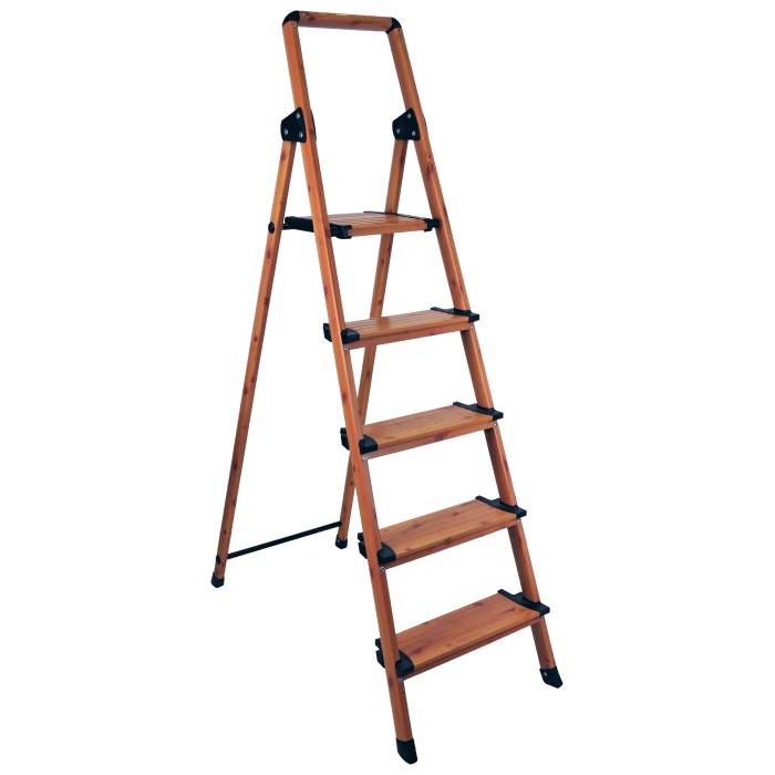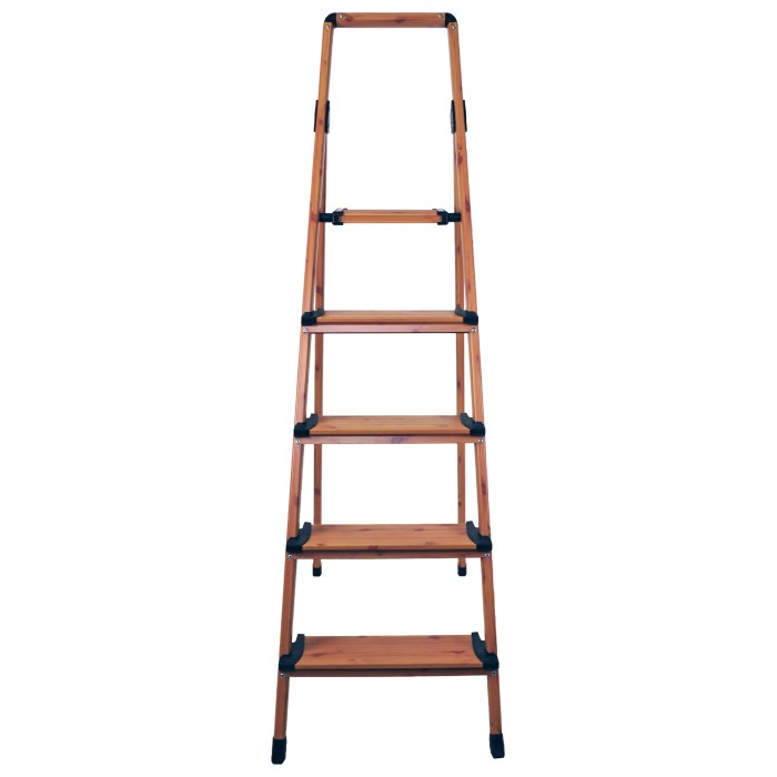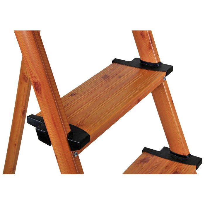 Раскладная стремянка из алюминиевого профиля с защитным покрытием и с пятью ступеньками, высотой 165 см, собственной массой 4,9 кг, позволяет выдерживать нагрузку до 150 кг. Глубина ступени 13 см. Цвет под дерево, покрытие - краска.