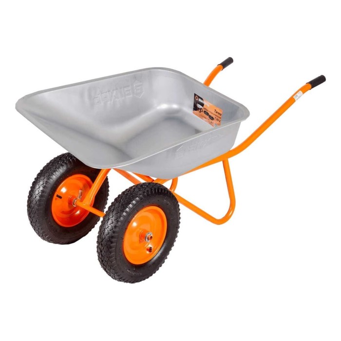 - Тачка имеет 2 колеса. Это обеспечивает отличную устойчивость и легкость перемещения.