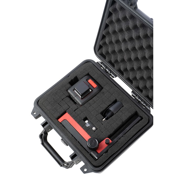 Объемный размер. Размеры кейса (ДхШхВ): внутренние - 240х185х100 мм, внешние -265х245х125 мм. Большинство моделей лазерных уровней или акссесуаров можно разместить внутри этого кейса.